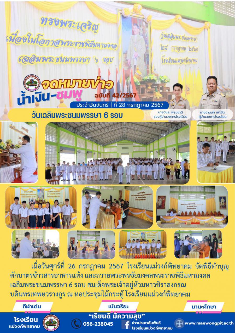 เนื่องในโอกาส พระราชพิธีมหามงคล เฉลิมพระชนมพรรษา 6 รอบ สมเด็จพระเจ้าอยู่หัวมหาวชิราลงกรณ บดินทรเทพยวรางกูร ข้าพระพุทธเจ้าขอพระราชทานถวายพระพรชัยมงคล ทรงพระเกษมสำราญ มีพระพลานามัยแข็งแรง สถิตเป็นมิ่งขวัญปวงชนชาวไทยตราบนานเท่านาน ขอทรงพระเจริญยิ่งยืนนาน